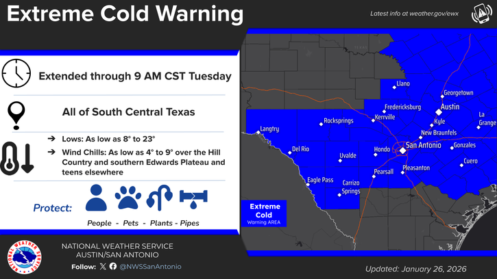 The Extreme Cold Warning for south central Texas has been extended through 9 a.m. Tuesday.